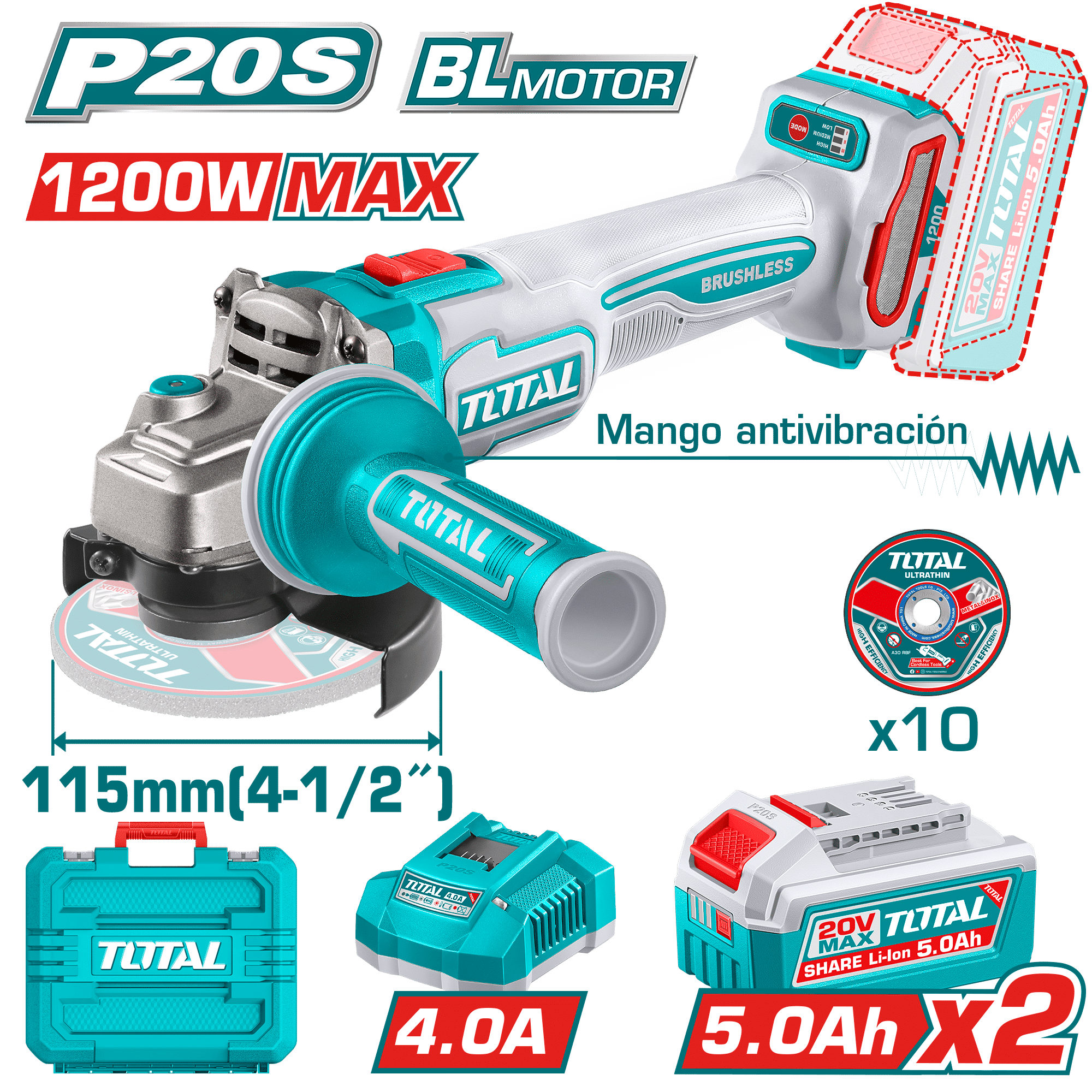 | Accesorio | 1 juego de discos abrasivos para corte de metal (10 piezas) – 2 baterías de 5, 0 Ah (TFBLI20531) – 1 cargador (TFCLI20411) |