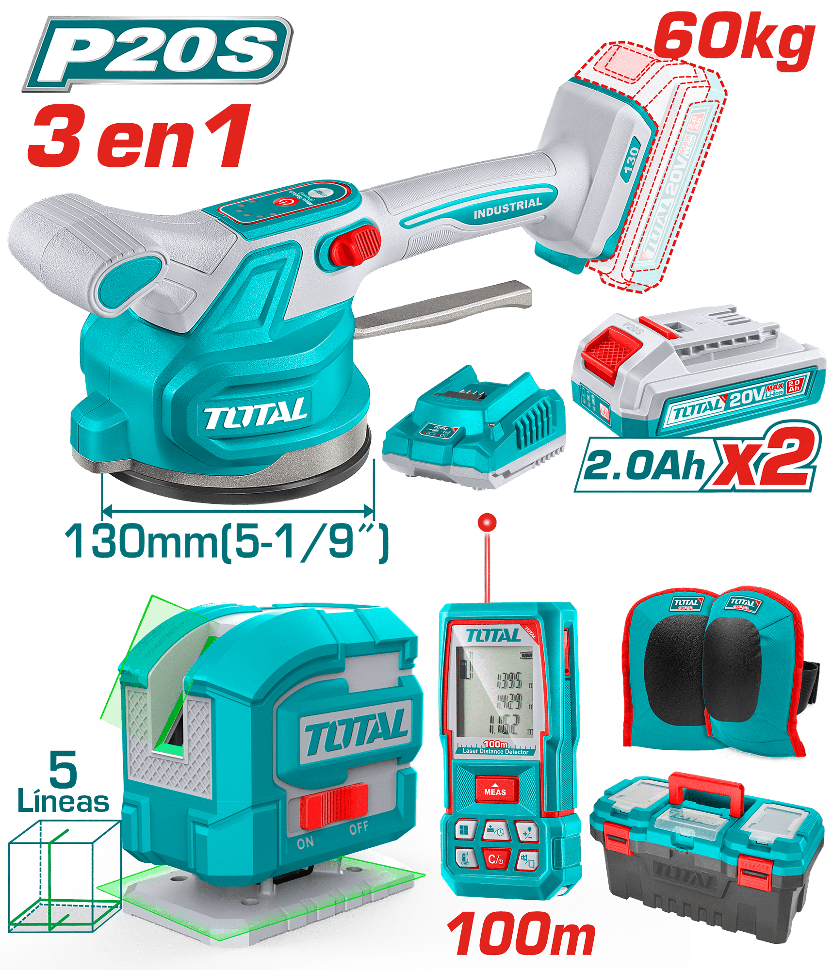 2 Baterías de 2.0 Ah (TFBLI20011) – 1 Cargador (TFCLI2001) – 1 Control remoto – 1 Pieza de soporte