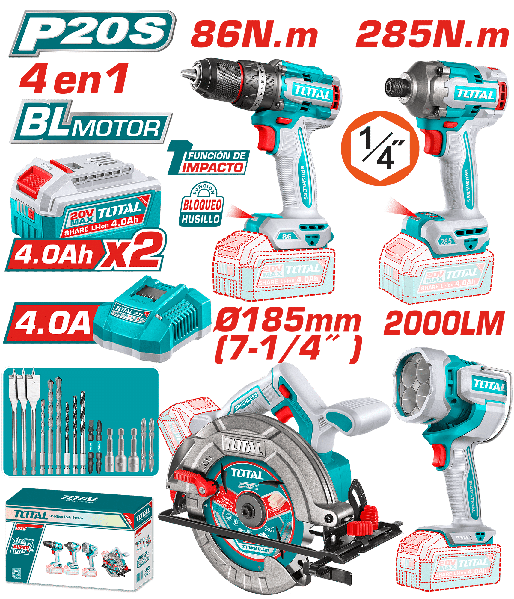 | Accesorio | 3 brocas planas para madera (16, 19, 22 mm) – 3 brocas para mampostería (5, 6, 8 mm) – 3 brocas HSS (4, 5, 6 mm) – 2 puntas de destornillador de impacto de 65 mm (PH2+PH2, PH2+SL6) – 1 mango auxiliar – 2 puntas de destornillador – 3 llaves de tuercas – 1 hoja de sierra de 185 mm – 2 baterías de 4.0 Ah (TFBLI20021) – 1 cargador (TFCLI20411) |