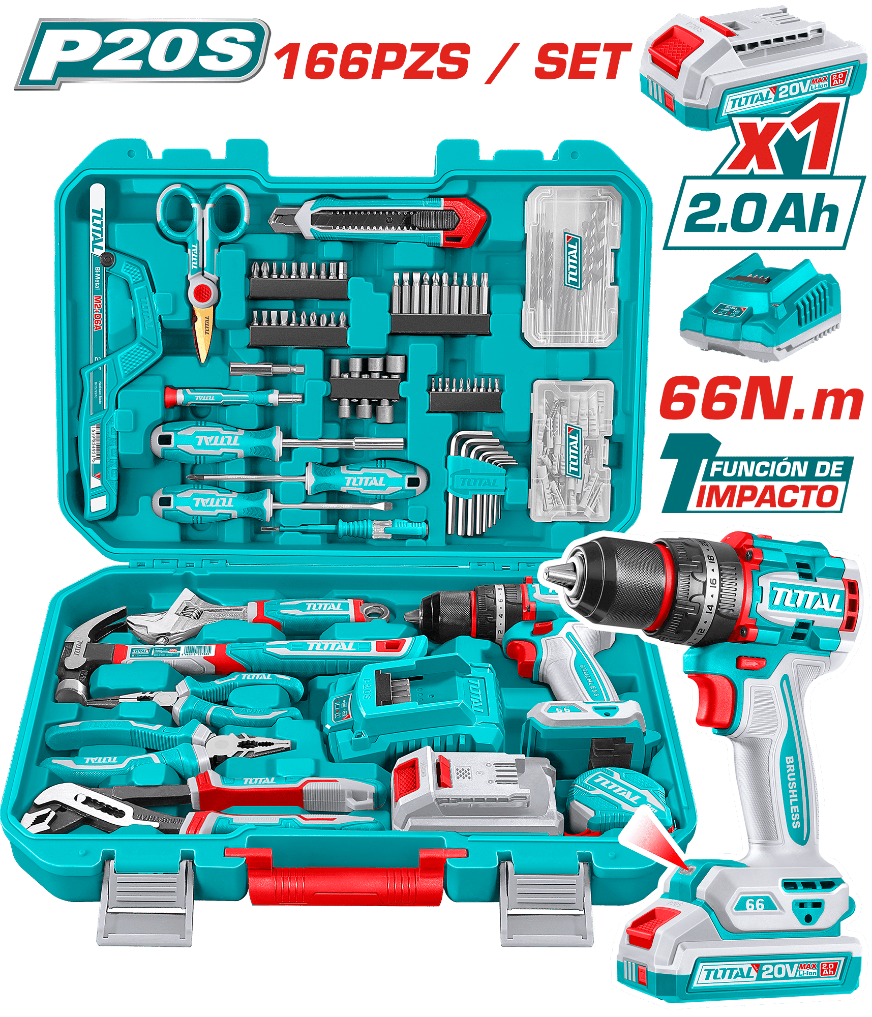 1 Pza martillo de uña de 8oz – 1 Pza destornillador SL5.5×100 – 1 Pza destornillador PH1x100 – 1 Pza alicates de bomba de agua de 10" – 1 Pza alicates combinados de 7" – 1 Pza alicates de punta larga de 6" – 1 Pza llave ajustable de 8" – 1 Pza lápiz de prueba – 1 Pza cinta métrica de acero de 3m – 1 Pza cuchillo de hoja retráctil – 1 Pza vástago magnético de 1/4" 100mm – 1 Pza mango de destornillador de precisión de 4mm – 10 Pzas puntas de destornillador de precisión: SL1.5, SL2, SL3, PH000, PH00, PH0, T6, T8, H1.5, H2.5 – 1 Pza tijeras de electricista de 5.5" – 1 Pza marco de sierra para metales mini – 8 Pzas llaves hexagonales: 1.5, 2, 2.5, 3, 4, 5, 5.5, 6mm – 5 Pzas brocas para mampostería 4, 5, 6, 8, 10mm – 5 Pzas brocas helicoidales 2, 3, 4, 5, 6mm – 4 Pzas brocas para madera 4, 5, 6, 8mm – 20 Pzas puntas de destornillador SL3, SL4, SL5, SL6, PH0, PH1, PH2, PH3, PZ0, PZ1, PZ2, PZ3, T10, T15, T20, T30, H3, H4, H5, H6 – 10 Pzas puntas de destornillador: SL4, SL5, SL6, PH1, PH2, PH3, T10, T15, T20, T30 – 7 Pzas casquillos de potencia (Cr-V): 5, 6, 7, 8, 9, 10, 11mm – 1 Pza portapuntas magnético – 40 Pzas tornillos (22pzas*ST3.5, 10pzas*ST4, 8pzas*ST5) – 40 Pzas tacos de plástico (22pzas*5mm, 10pzas*6mm, 8pzas*8mm)