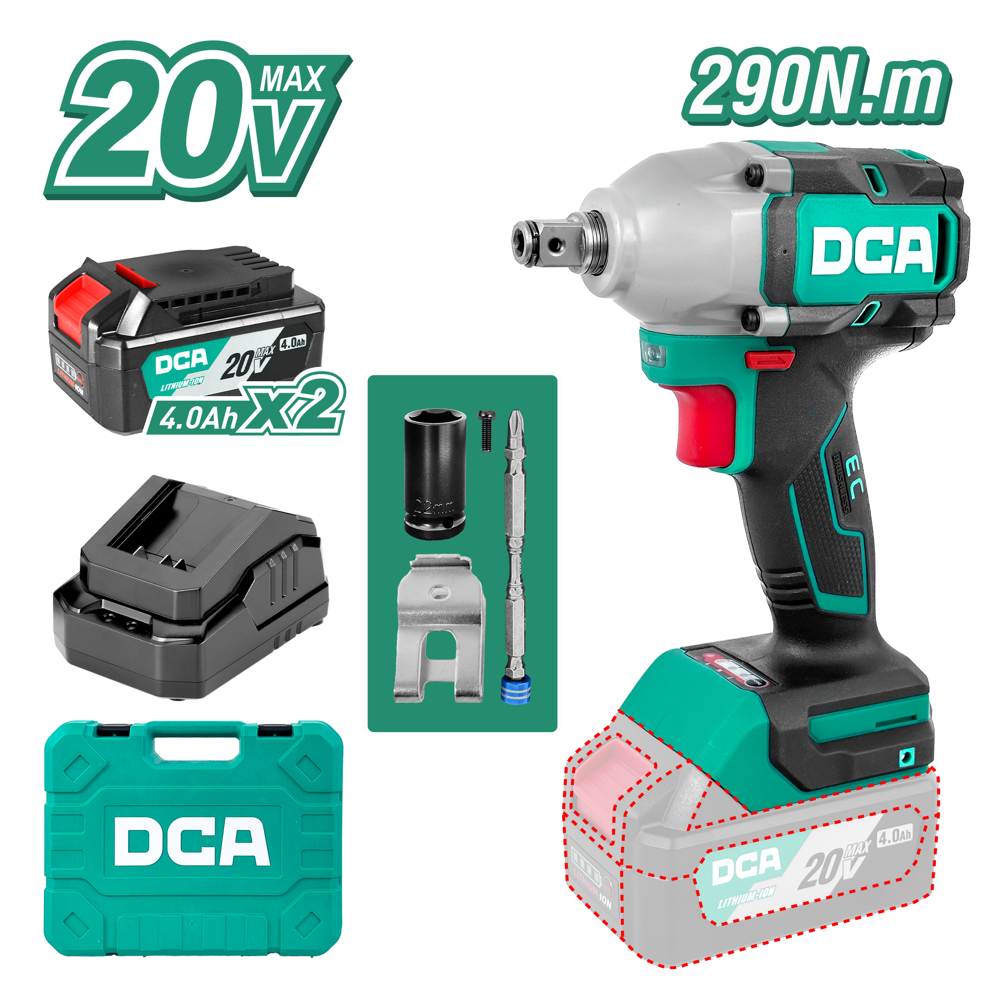 Cargador 2.0A (FFCL20-02) – 2 Baterías 4.0Ah (FFBL2040) – Dado de 22mm – Gancho – Punta magnética antihavo