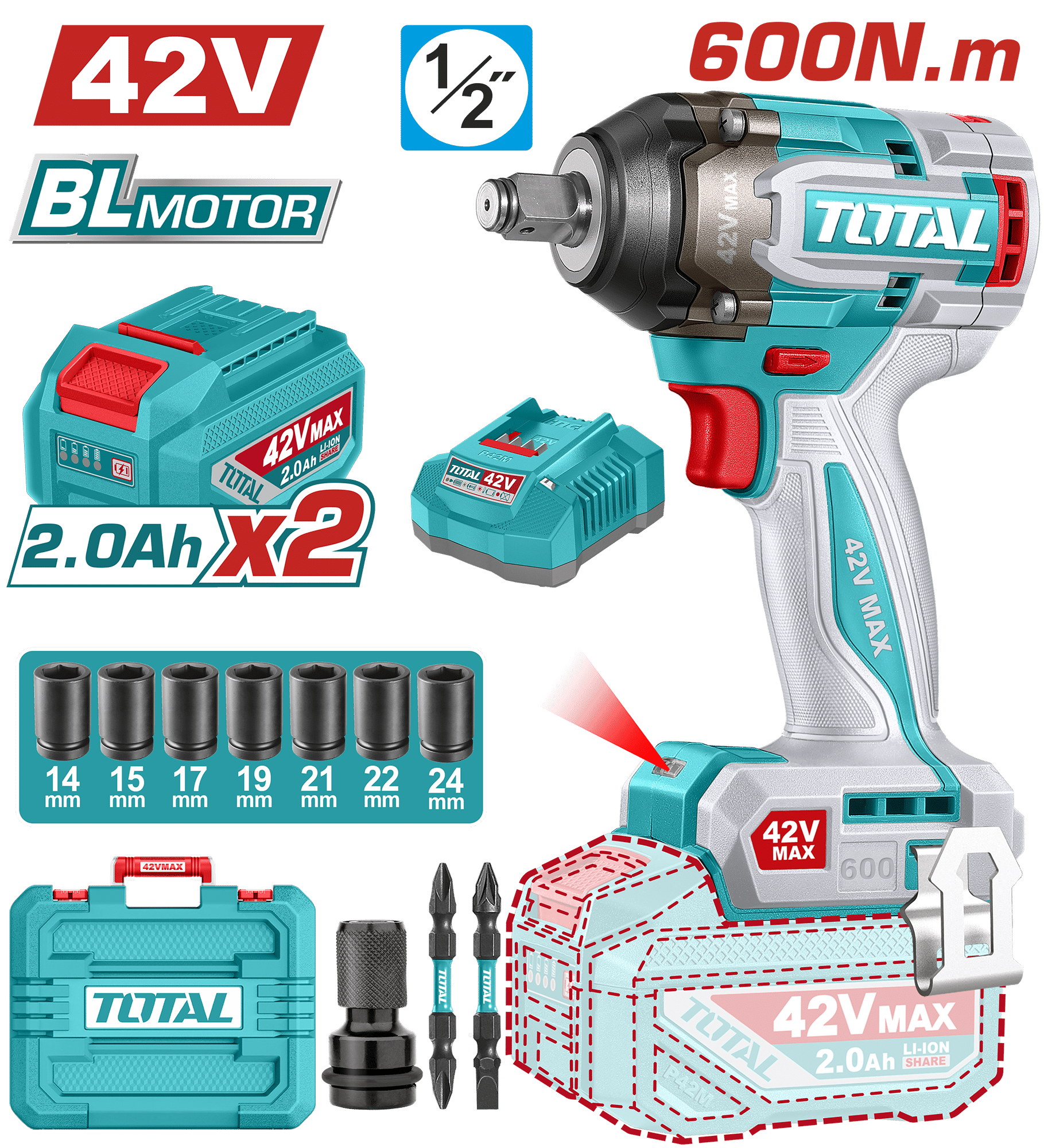 7 dados (14 -15 -17- 19 -21 – 22 y 24 mm) – 1 destornillador cuadrado de 1/2´´ a hexagonal 1/4´´ – 2 puntas de destornillador – 2 baterias -1 cargador
