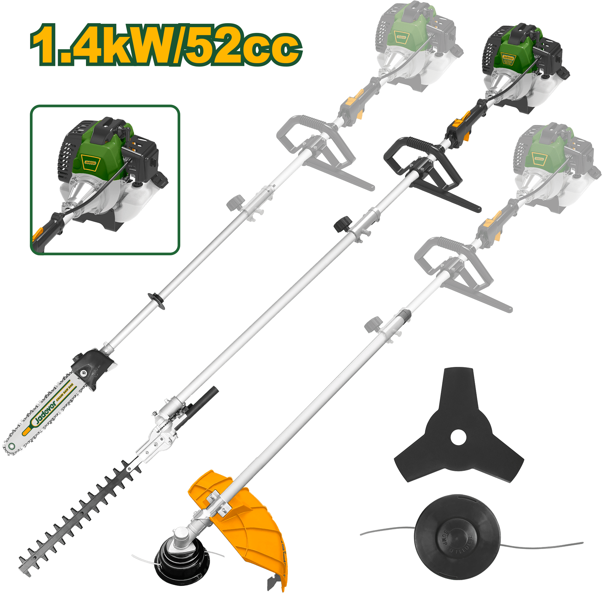 Recortador de setos (1 pieza) – Motosierra (1 pieza) – Carrete de hilo 2.4 mm x 4 m (JDJC1424) (1 pieza) – Cuchilla cortamalezas 3T 255 mm (1 pieza) – Arnés simple (1 pieza) – Kit de herramientas (1 set)