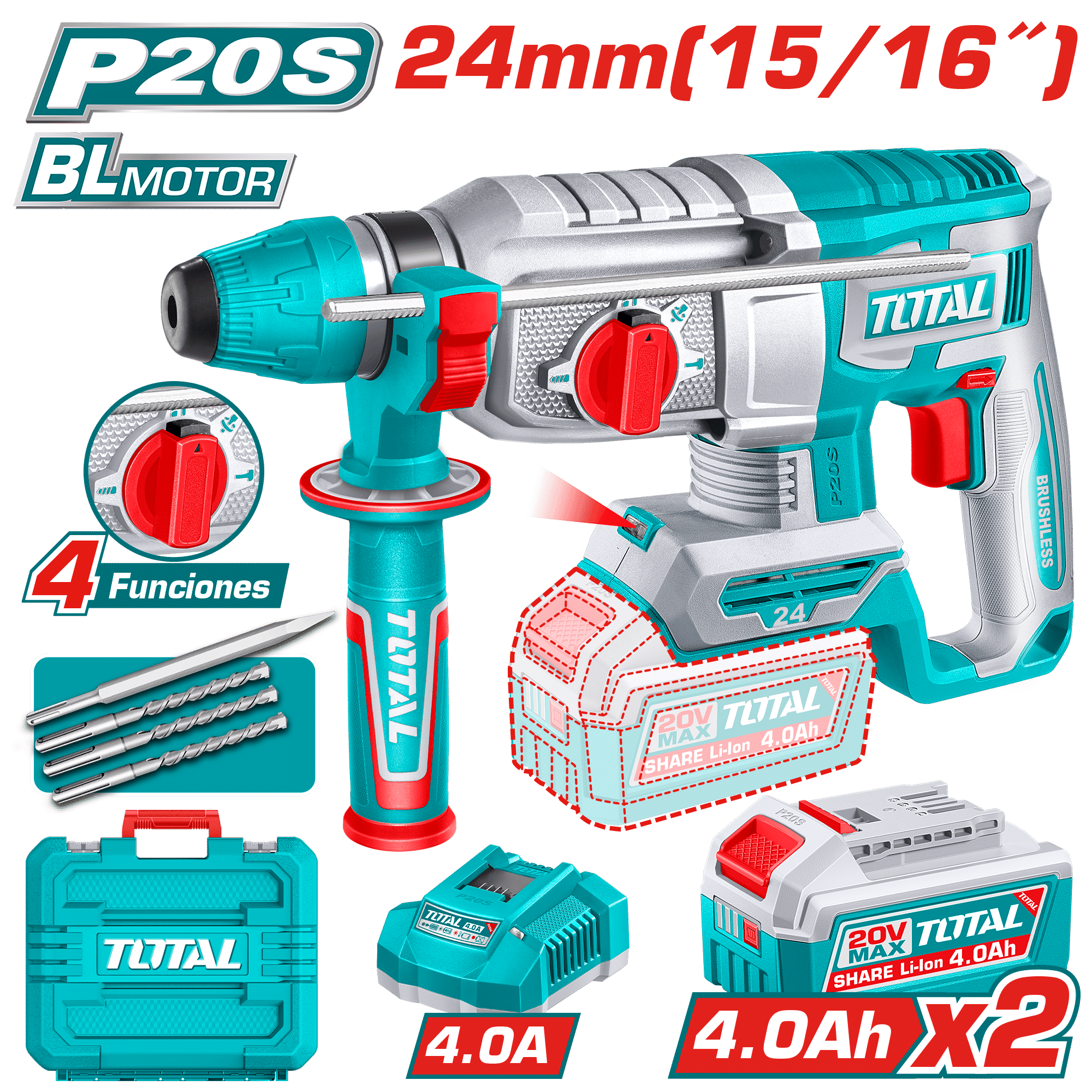 | Accesorio | 3 brocas (6, 8, 10 mm) – 1 cincel – 2 baterías de 4.0 Ah (TFBLI20021) – 1 cargador (TFCLI20411) |