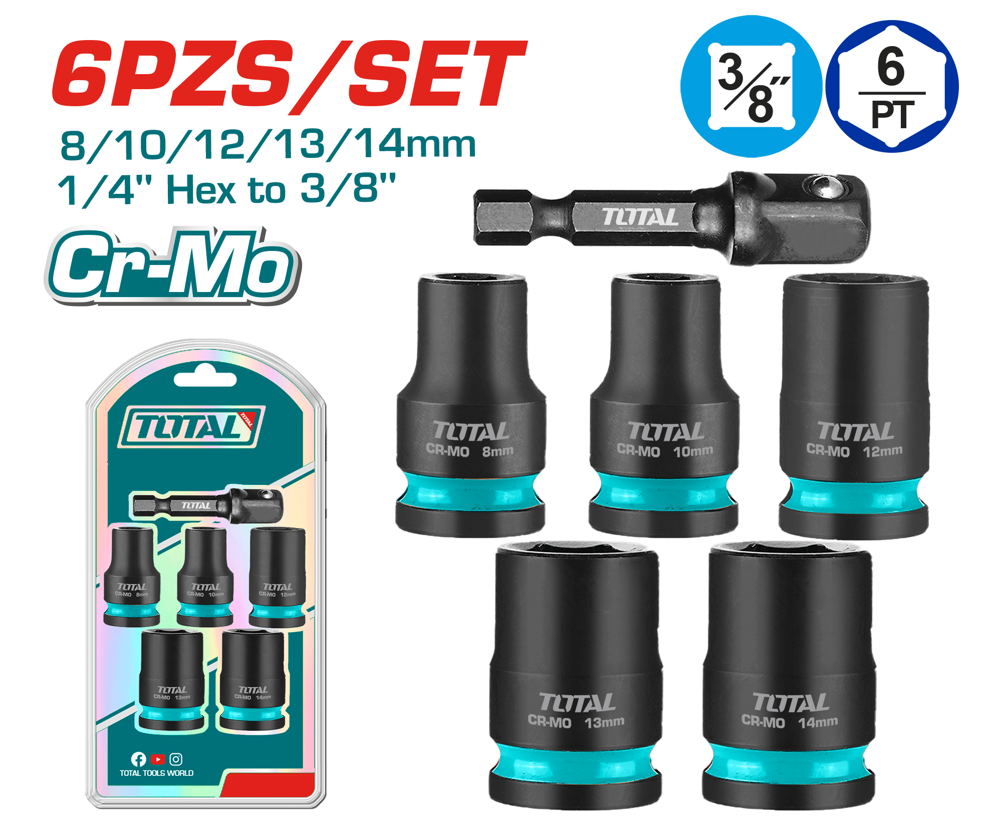 | Accesorio | 5 dados de impacto 3/8"DR: 8/10/12/13/14mm – 1 adaptador de impacto de 1/4" Hex a 3/8" |