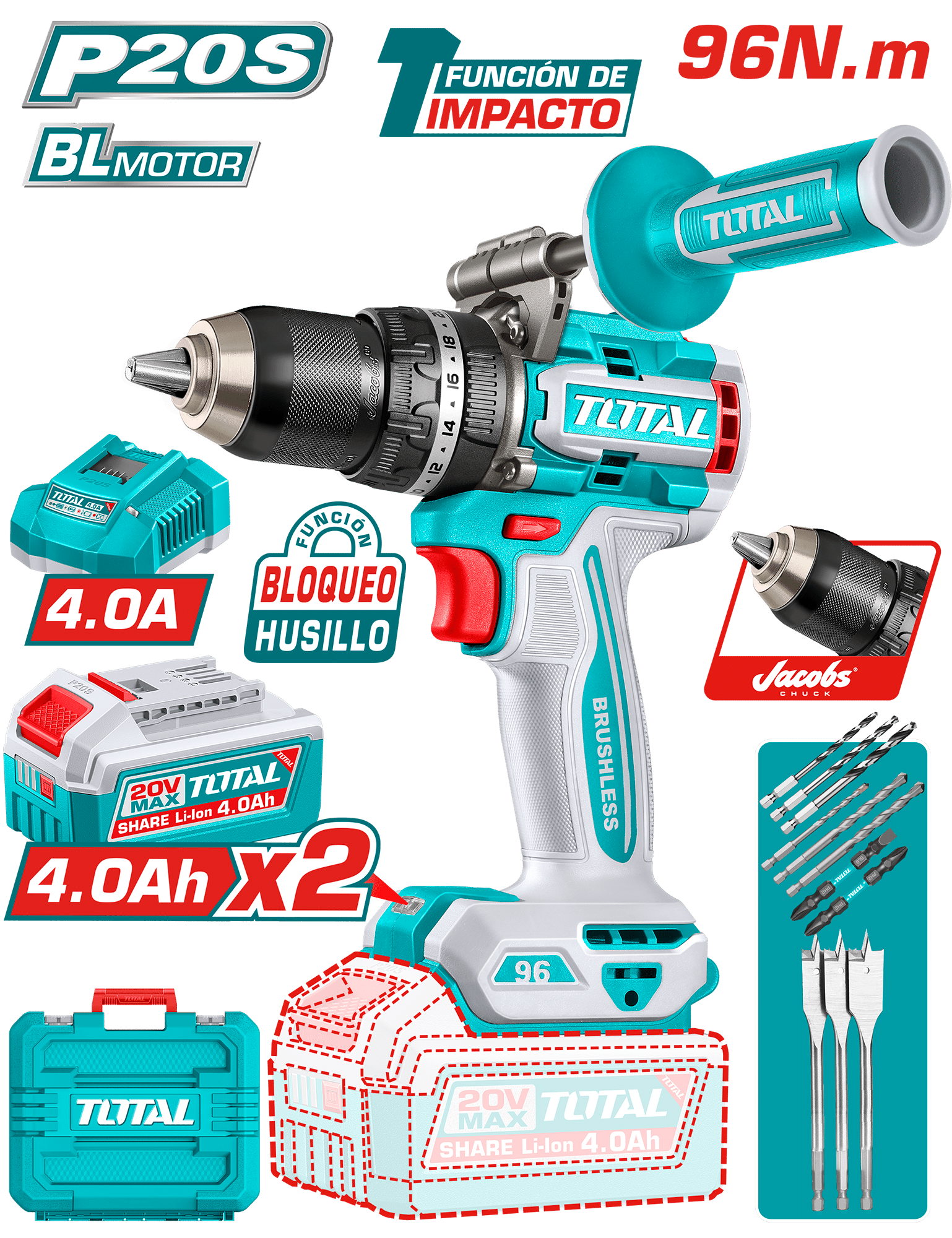 | Accesorio | 2 baterías de 4.0Ah (TFBLI20021) – 1 cargador (TFCLI20411) – 3 brocas planas para madera (16, 19, 22 mm) – 3 brocas para mampostería (5, 6, 8 mm) – 3 brocas HSS (4, 5, 6 mm) – 2 puntas de destornillador de impacto de 65 mm (PH2+PH2, PH2+SL6) – 1 mango auxiliar |